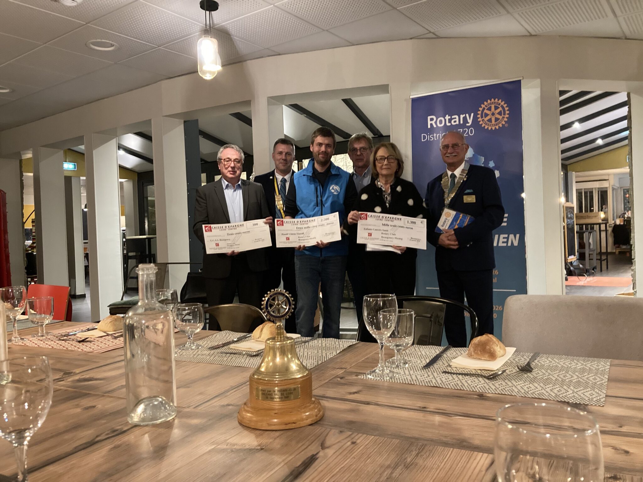 La remise des chèques a eu lieu en présence du Gouverneur du District 1720 , Alain Dulac, du Gouverneur adjoint, Christophe Empereur, et du 1er adjoint de la mairie de Meung sur Loire. Les chèques ont ete remis par le président du club Martin Doucet à : Enfants Cancers Santé, Handi’Chiens, et le ccas de Meung sur loire.